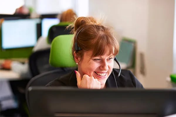 A customer service agent smiles as she talks to a customer with the aid of an interpreter