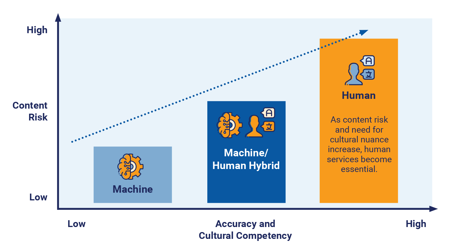 AI language solutions offer significant cost savings for low-risk, transactional interactions—think appointment scheduling or order confirmations. However, as the interaction grows more complex or emotionally charged, the stakes increase. Misinterpretation in high-touch settings like mental health or child welfare isn’t just costly—it can be catastrophic. A hybrid strategy—using AI for routine or low-stakes interactions and human linguists for high-complexity interactions—helps organizations maximize efficiency without compromising on care, clarity, or compliance.