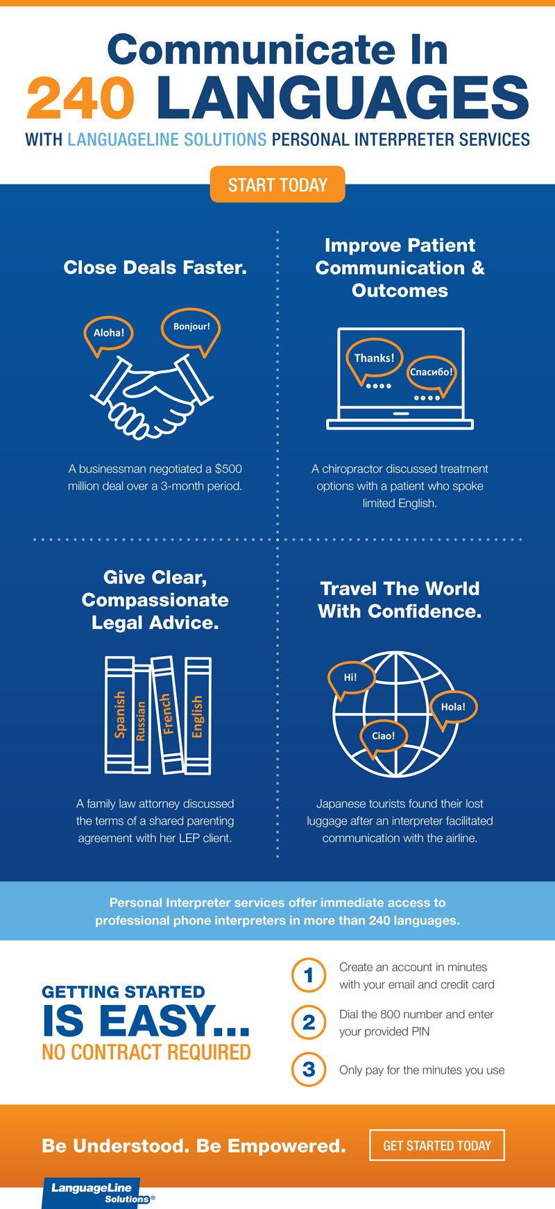 Our Personal Interpreter services are ideal for clinics, legal professionals, and small businesses that need fast and reliable access to interpretation. Check out this infographic to learn more about how these services can help you expand your reach, improve customer service, and achieve compliance with laws and regulations.