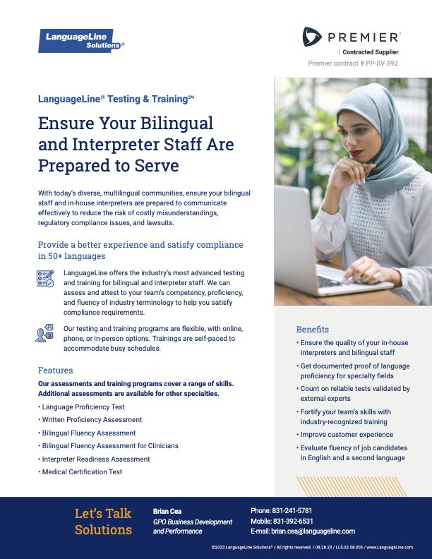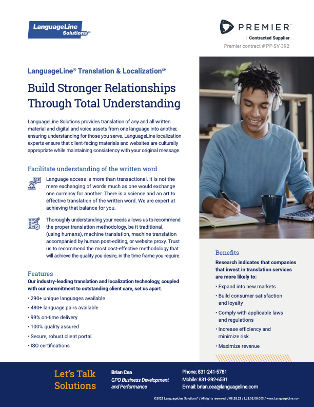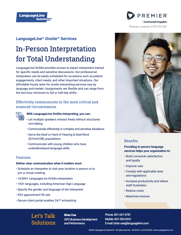 For more information, contact Brian Cea, GPO Business Development and Performance, at 831-241-5781 or brian.cea@languageline.com.