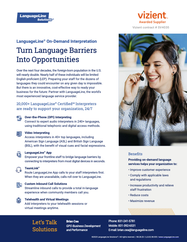 For more information, contact Brian Cea, GPO Business Development and Performance, at 831-241-5781 or brian.cea@languageline.com.