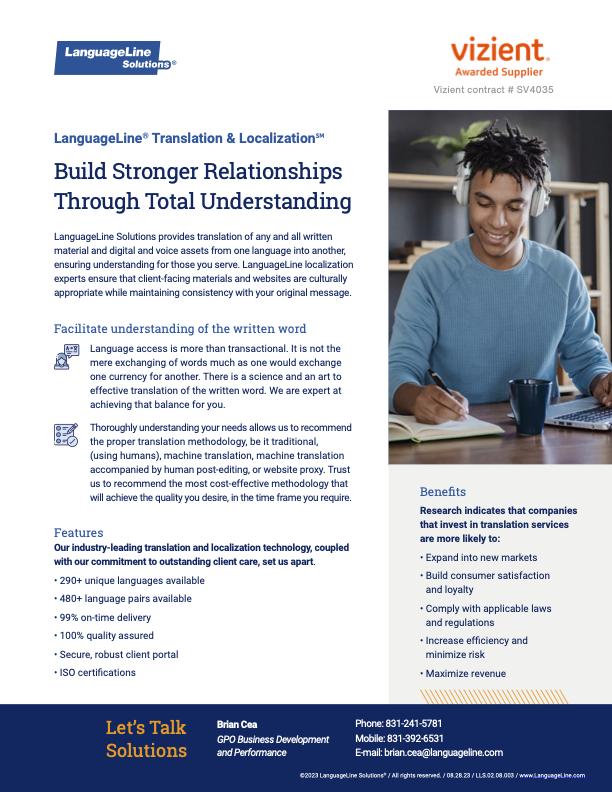 Vizient has a mission to strengthen members’ delivery of high-value care by aligning cost, quality and market performance. As a Vizient supplier, LanguageLine plays an integral role in helping them fulfill that commitment.