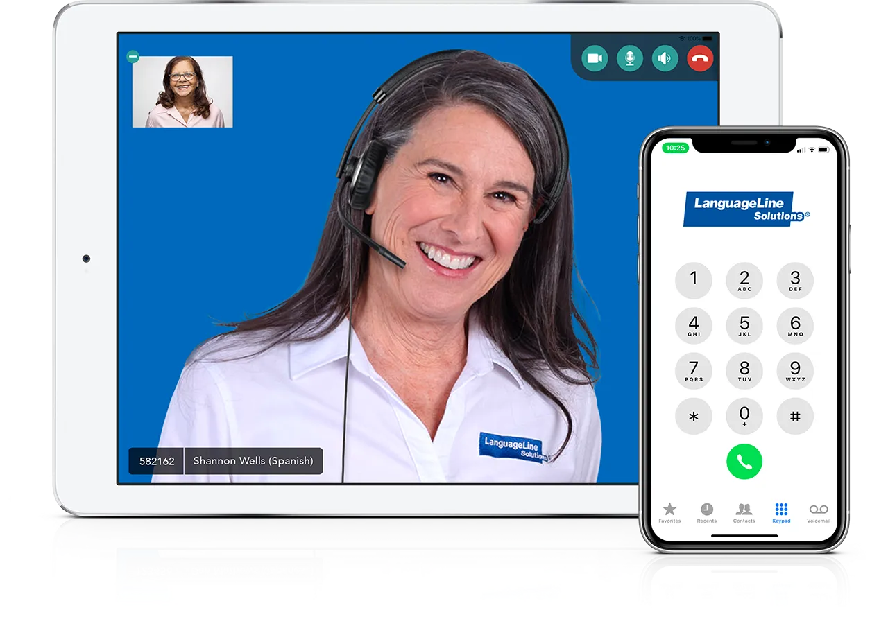 A smiling LanguageLine interpreter and an LEP caller in a video session on an ipad with an iphone showing the dialin to LanguageLine in the foreground