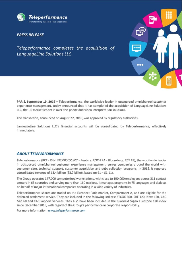 Press Contact Scott BrownContent ManagerLanguageLine Solutions Email LanguageLine Solutions One Lower Ragsdale Drive, Bldg. Two Monterey, CA 93940 Teleperformance press release distributed September 19, 2016.